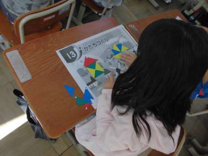 1時間目ということで,今日は色板を使って,教科書にある形を並べたり,自分で好きな形を作ったりしました。