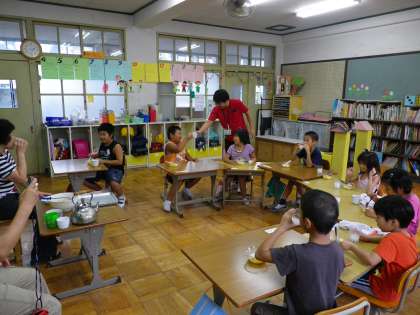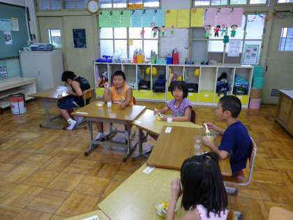 いよいよ午前中みんなが作ったフルーツ白玉だんごを食べます。その前にジュースで乾杯!みんな黙々と食べています。「おだんご、おいしいねぇ。モチモチしているよ。」