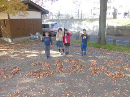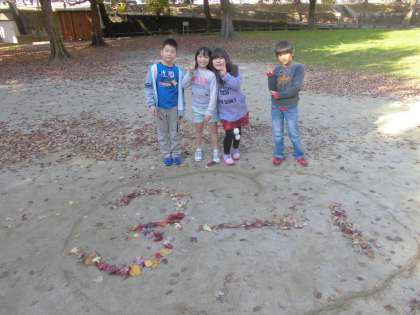 2はんの作品ということで,大きく2はんを落ち葉で作りました。その両サイドには,ハートとほしでデコレーションを施しました♪