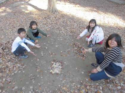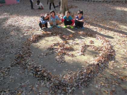 秋と大きく作り,ハートで囲みました!手際よく落ち葉を集め,スムーズに作ることができていました♪