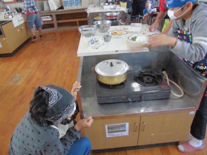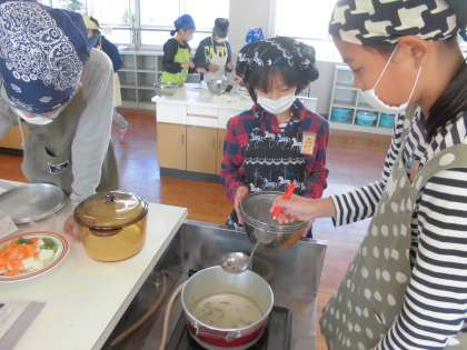 煮干しでだしをとったり、みんなで協力して味噌汁を作っていきます。