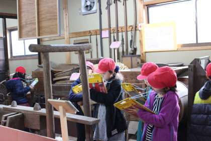 お腹もいっぱいになったところで,最後に京の田舎民具資料館へ出発!山科区にあり,ここでは,昔の道具等を見て回り,昔の人たちの知恵や今の生活の工夫について学びました。様々な道具があり,どういう風に使われていたのかを館長さんに説明してもらいながら,メモをたくさんとりました。このメモを今後の社会科の学習で生かしていきたいと思います。