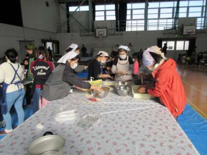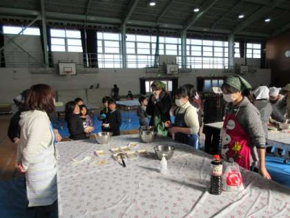 お餅を配るのに体育館は大忙しです。