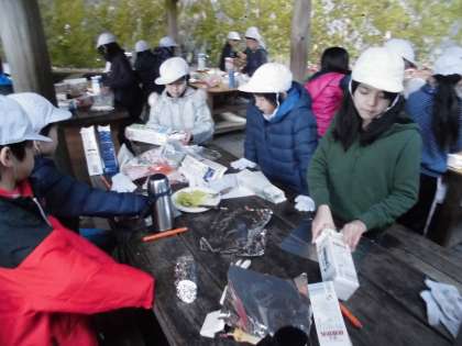 3日目の朝食はパックドックです。丁寧にアルミホイルで包んだパン・ソーセージ・キャベツを,パックを燃やして温めて食べました。朝はかなり冷えたので,パックを燃やしている火で暖をとっている子がたくさんいました。