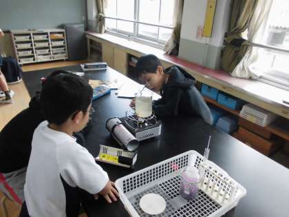 今日は,水のあたたまり方を実験しました。温度を色であらわせられるテープで水がどこからあたたまっていくのか確認したり,みそをつかって,あたたまっている水の動きを観察したりしました。こどもたちは,楽しそうにみその動きに見入っていました。