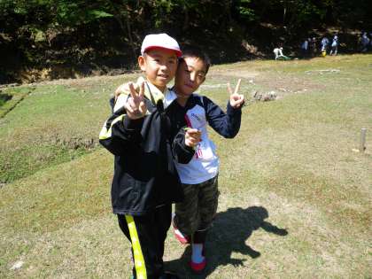 現地に到着して昼食のお弁当を食べました。子どもたちの中には,弁当よりもバッタやクモやトンボと動き回っていました。かと思うと,「虫のいるところでお弁当なんか食べられへん」と叫ぶ子。いろいろな子どもたちがいて楽しいですが,せっかく来たのだから,何か楽しい思い出を残してほしいです。写真のクモは,メスでおなかに卵があるそうです。子どもに教えてもらいました。