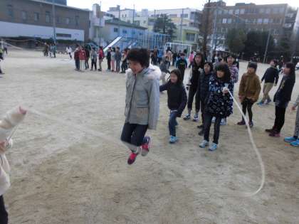 体力作りが始まりました。みんなで声を掛け合いながらテンポよく跳んでいきます。やはり,縄をまわす人が上手だと回数が増えているようで,どうすればより回数が増えるか考えながら跳んでいます。