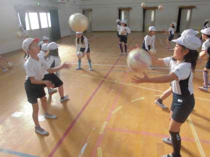 他には,ボール交換をしました。二人ペアでボールを同時に投げ,キャッチするという活動でした。その後には,足でパスをするという活動に変わり,お互いの息を合わせてボールを交換しました。