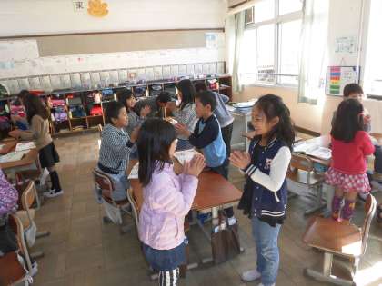「あんたがさどこさ」では,『さ』のところで,ペアの人とハイタッチをしました。