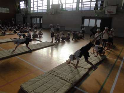 体育科で取り組んでいる「マットあそび」も終盤をむかえ,今週からテストに取り組んでいます。めあての技は,「前転・後転・側転」の3つで,一つでもできる技を増やそうと,子どもたちはコツコツと練習を進めています。そのおかげで,初めはできなかった後転で真っすぐに回ることができるようになった人など,少しずつ成長が見られるようになってきました。時には互いの技を見合いながら,協力して技の習得を目指していきたいと思います。
