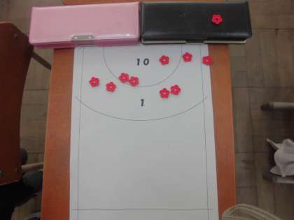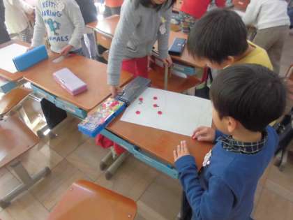 算数科「大きいかず」の学習が進んでいます。おはじきを使ったゲームで,大きい数の表し方を確認し,2人組で対戦しました。