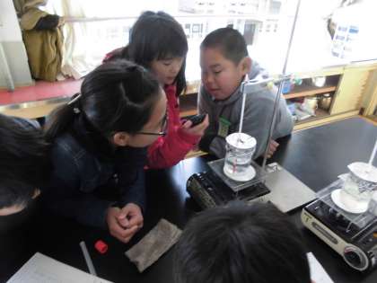 じゃあ調べてみようということで,20分間水をガスコンロで熱し続けて1分ごとに様子をメモしていきました。ストップウォッチを見ながら「5分!泡出てきた〜。」や「9分で沸騰してる!」ととっても楽しそうに実験を観察していました。次はどんな実験をするのか待ち遠しい子どもたちでした。