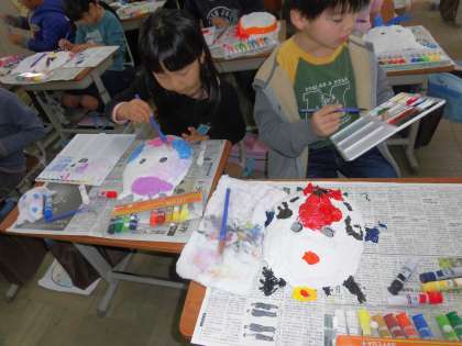 今回は,お面の顔に色を塗りました。