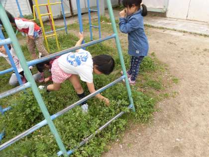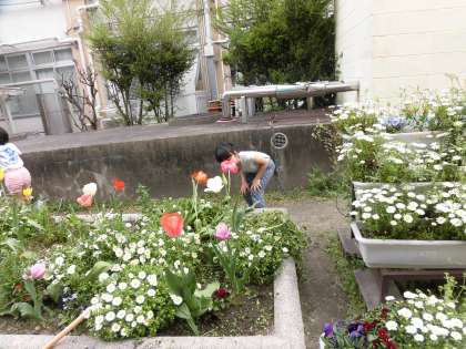 チューリップの花のにおいをかいで,「いいにおいがする〜。」という子がいたり,ペンペン草で音を鳴らしてみたりとしました。