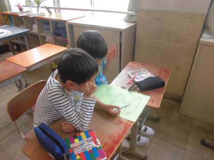 休み時間には,さっそくいろいろな先生に質問をしてポスター作りをしたり,みんな遊びについて話し合ったりしています。