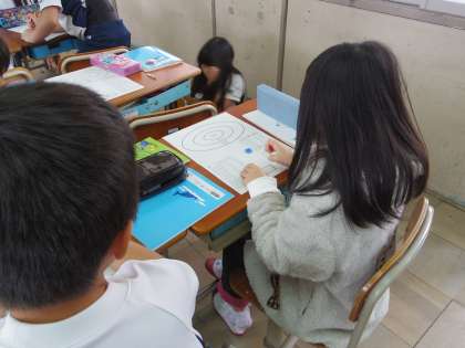得点がかかれた紙の上でおはじきをはじき,おはじきを得点の枠に入れて点数を競うゲームをしました。