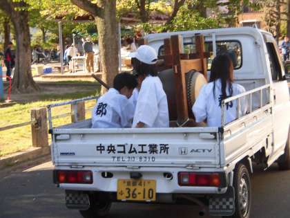 6年生は車に乗って太鼓を叩いたり,マイクを使って掛け声をかけたり…