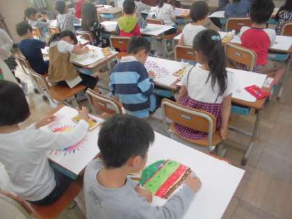 自分のおひさまはどんな形やどんな色にしようかなと考え,楽しみながら描きました。
