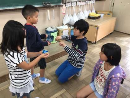 今日は各クラスごとに,1年生にぶんぶんごまをプレゼントしに行きました。
