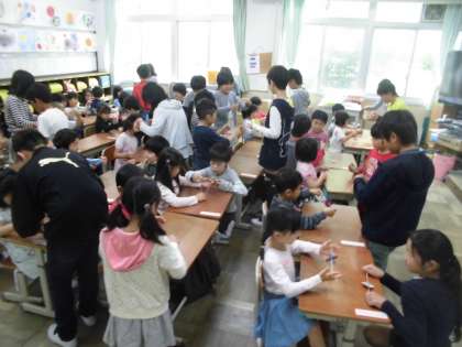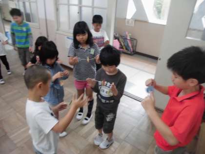 1年生を迎える会に向けて,5年生から「ブンブンごま」のプレゼントをもらいました。