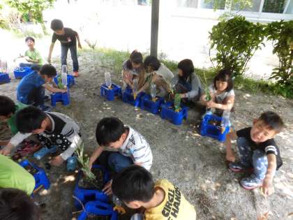ミミズや幼虫が出てくることもあり,驚きながら「虫がいるっていうことはいい土なんだね。」と言うと嬉しそうに虫も観察していました。