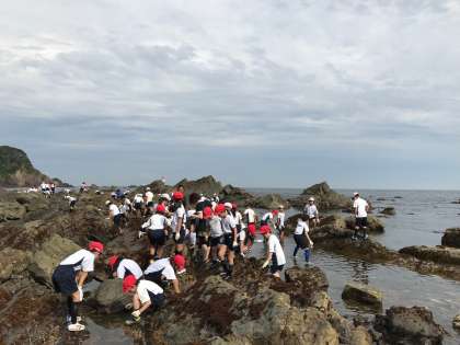 裏山ラリー、釣り体験、芝生広場遊びを終え、つぎは宮崎浜で磯観察です!