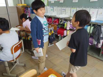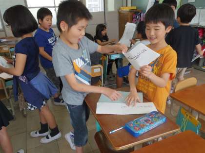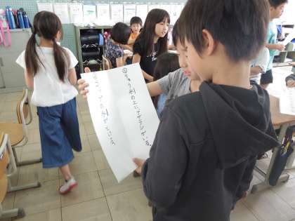 例えば「犬」という字は「いぬ」「ケン」と読みます。音読みと訓読みの文をそれぞれ書き,クイズを作りました。「この漢字って音読みだけしかないの?」「いろいろな読み方があっておもしろいな。」など漢字の読み方に興味をもって活動することができました。