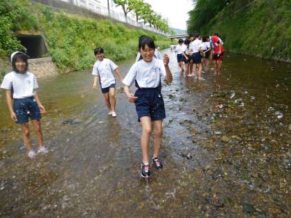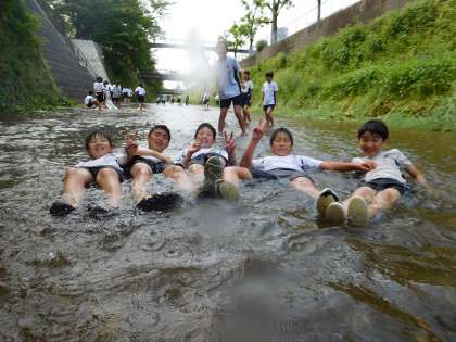 思ったよりも冷たい水の天神川でしたが,みんな大はしゃぎ。