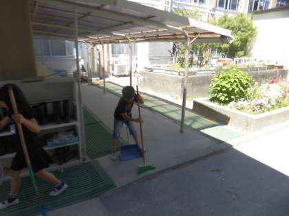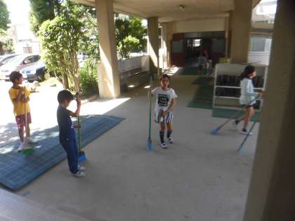 雲一つない晴天の中で,清掃活動に勤しんでいる子どもたち。「自分が学校をきれいにしているんだ。」という気持ちがひしひしと伝わってきます。これからも頑張って綺麗にしましょう。