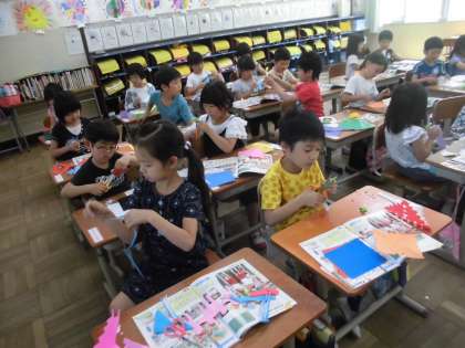 図工の学習ではさみの使い方を学習し,折り紙を切っていろいろな形のかざりを作りました。できた作品は教室前に掲示しています。