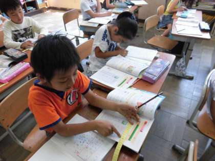 前の時間に数図ブロックを使ってはかったものを,ものさしを使って測っていきました。