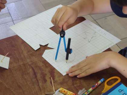 工作用紙を使っていろいろな形のこまを作りました。まるい形をかくために,初めてコンパスを使いました。まだまだ美しい円をかくのは難しそうです。練習練習!!