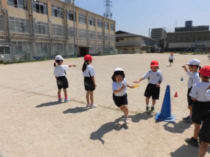 体育のリレー遊びで,トラックを使ってクラス対抗のリレーをしました。