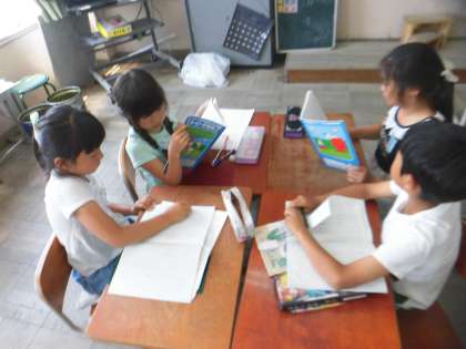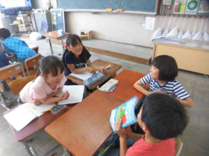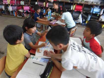 国語の「よい聞き手になろう」では,話し合いの時にいたら面白いキャラクターになりきって話し合いをしました。たとえば,「うなずきん」というキャラクターになった子は,だれのどんな話にも「うん。うん。」とうなずいて話を聞きます。話し手は嬉しくなって,どんどん話をしたくなってきます。ほかにも,「メモメモくん」になりきった子は,話し合いで出た話題を,残さずメモに書きます。「あれ?さっきなんて言ってたっけ?」と疑問に思っても,メモを見ればすぐに解決できます。いろんなキャラクターになろうと考えながら話し合う子どもたちの様子はとても楽しそうでした。