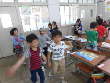 歌の最後に,「なかまをみつけて,こんにちは」のところでは,友だちを見つけて挨拶をして一緒に手をつないで散歩を楽しみました。
