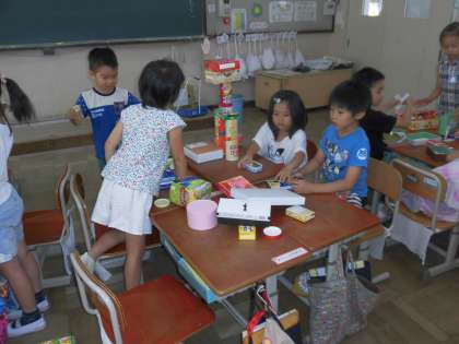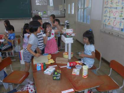 算数の時間に「いろいろなかたち」の学習で,おうちで集めてもらった箱や空き缶を使って班でいろいろなものを作りました。