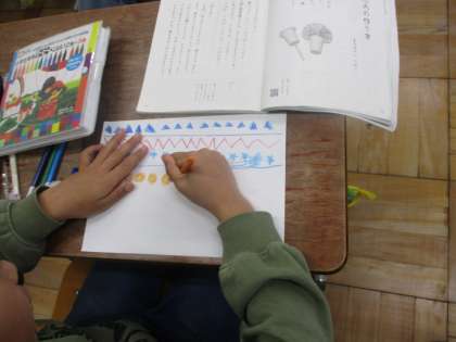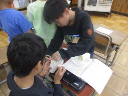 国語「紙コップ花火の作り方」の学習では、大事な言葉や文に気をつけながら一人で教科書を読み紙コップ花火を作りました。「内側て書いてある。向きに気をつけないと」や「一枚だけテープで止めるのか」などそれぞれ気をつけながら作りました。それでも、うまくいかない時は自然と子どもどうしで助け合う姿が見られました。