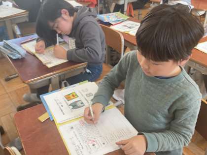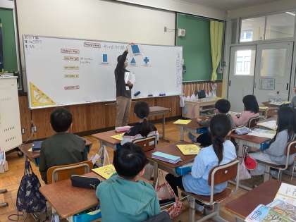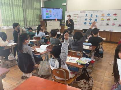 外国語活動で、いろいろな形の言い方を学習しています。ペアでゲームをしながら、形の言い方に慣れることができました。手本の発音をよく聞いて、難しい発音にも頑張って取り組んでいます。