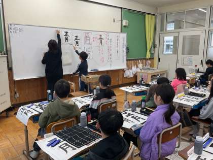 書写の学習で、これまで学んできたことを活かして「正月」の題字に取り組みました。一画一画ていねいに書くことができました。
