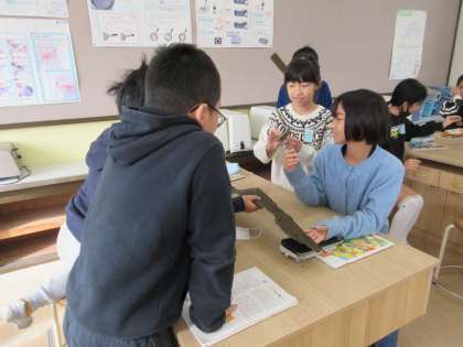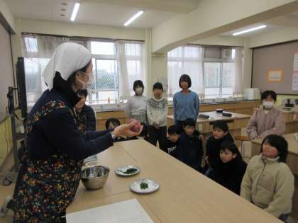 栄養教諭の先生の授業で「おいしい」ってなんだろうのテーマで五感を使って、味わい、おいしさのひみつを見つけることにチャレンジしました。「うまみ」を池田博士が発見したことや、昆布やかつお節が手間をかけて作られていることを知りました。そして利尻昆布や干ししいたけ、かつお節の香りを楽しみました。
