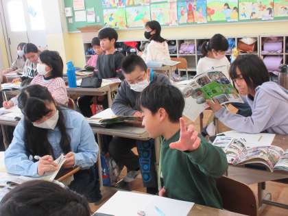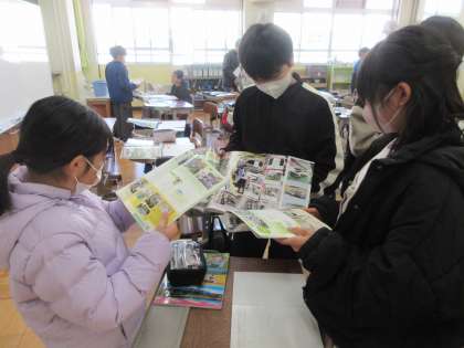 自動車を組み立てる工場の工夫について調べました。ビデオで自動車作りの簡単な歴史について知りました。その知識をもとに、予想では「アメリカのフォード社の自動車作りを一部真似て、さらに進化させたのでは…」という意見が出てきました。その後、車につけられたビラや何かのボタン、シートの写真からさらに一歩進んで工夫を予想した後、チームに分かれて工夫を調べ、その後交流することで、様々な工夫について知り、どのような利点があるのか考えました。