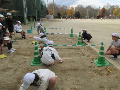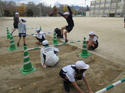 幅跳びの記録にチャレンジしました。リズムよい助走、思い切った踏切、安定した着地をめあてに班で協力して声をかけながら楽しく活動できました。