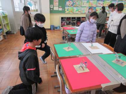 出来上がった立体作品「美しく立つはりがね」にタイトルを付けクリスマスカラーの緑・白・赤の画用紙を台紙として置く向きや角度もそれぞれよく考えてセッティングをしていました。友達の作品をしゃがんで下から見たり、水平に見たりと様々な角度から楽しみました。まるで小さな美術館のようでした。みんなそれぞれお気に入りの作品が見つかったようです。