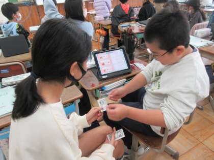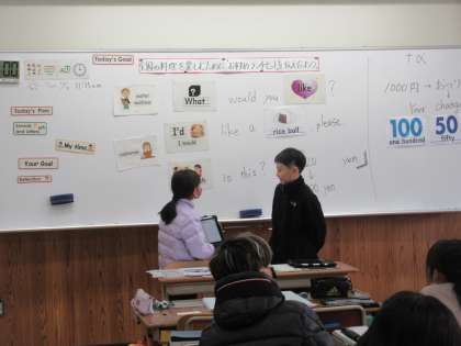 「what would you like?」「I’d like~」の表現を使って、お店の人の役、買う人の役になり英語でのやり取りを楽しみました。子どもたちはみんな、「これで外国に行ってお買い物ができるようになったね〜。」と言って喜んでいました。