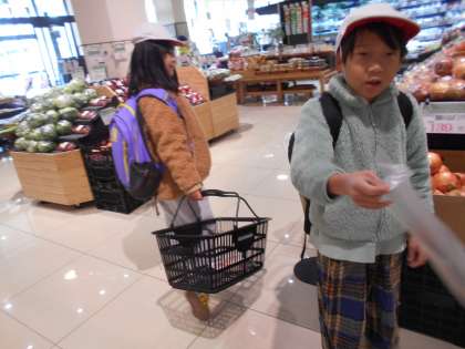 育てたブロッコリーと人参を使って、カレーを作ることになりました。まずは、材料調達!近くのスーパーに行きました。「道に飛び出さない」等気を付けることを確認し、安全に気を付けていくことができました。それぞれ協力して、食材を探しました。「このカレー、〇パーセント?」と辛さを調べたり、カニの足が動くのに驚いたりしながら買い物をしました。