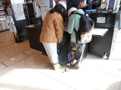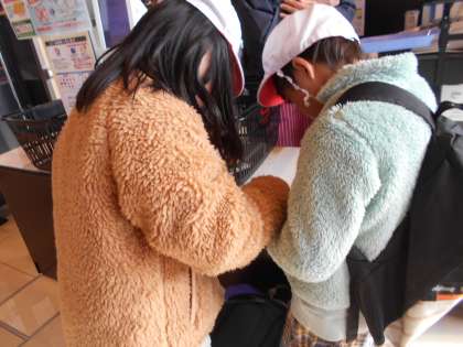 食材を決めたら支払い。普段の学習を生かして、金種を考えて支払います。その一生懸命さにレジの方も「中学生になったらチャレンジ体験に来てね。」「来たいです。」等、会話を弾ませる場面もありました。