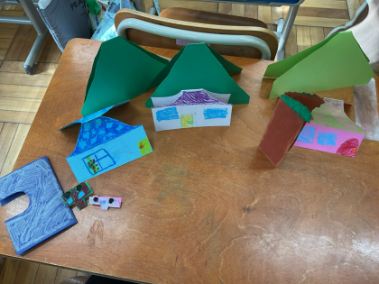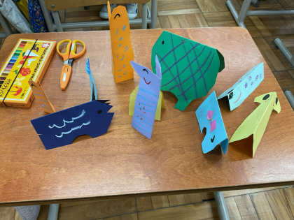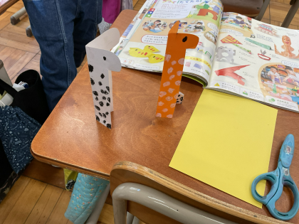 図工の学習では、画用紙を半分に折って好きな形に切って、立ててみて、思いついたものを作りました。