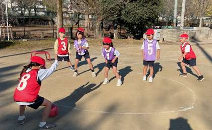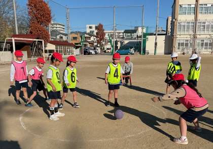 運動場でころがしドッジボールをしました。どうすればたくさん点数を取れるかをみんなで考え、試合の時には同じチームの友達に声をかけたり、自分から動いたりできるようになってきました。ボールを使っての試合は初めてでしたが、仲良く試合を楽しむことができました。