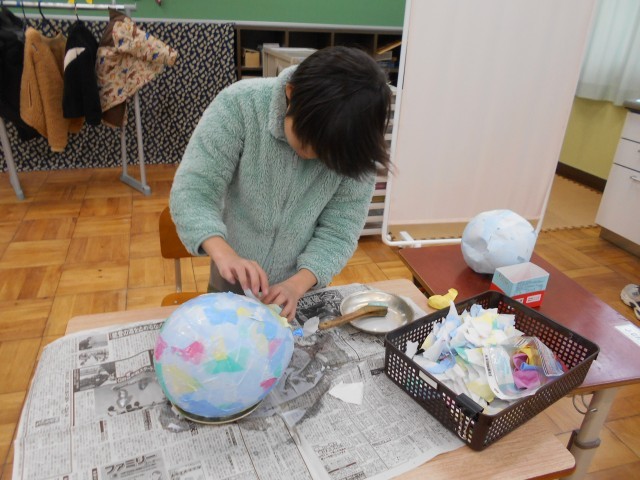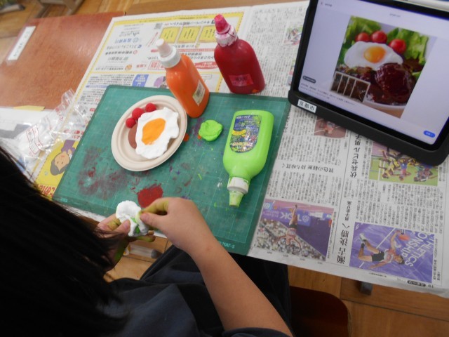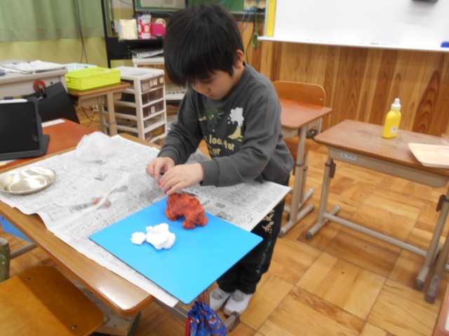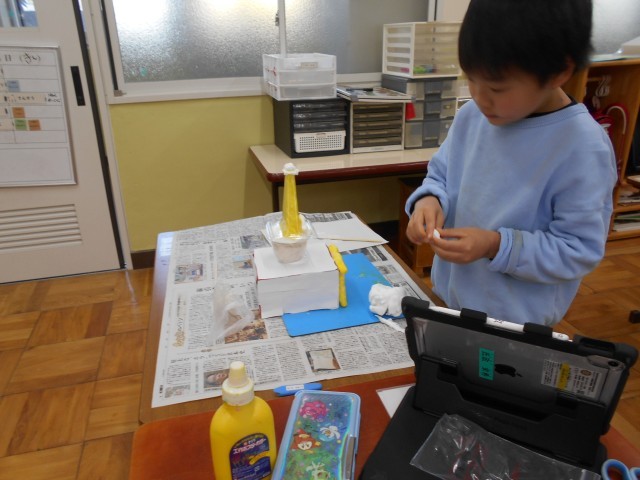 図工では、「小さな巨匠展」の作品づくりをしています。気に入った国旗を制作したり、好きな国の建物・食べ物・乗り物・自然等を廃材や粘土で制作したりしています。紙粘土に色をつけてこねるのが楽しくて、感触を楽しみながら造っています。出来上がりが楽しみです。