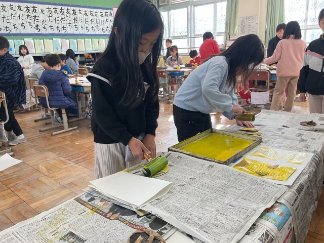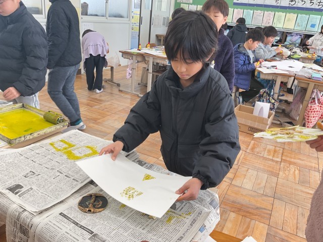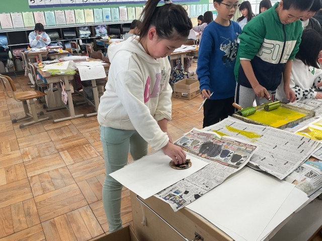 図工で紙版画の学習に取り組んでいます。いろいろな材料を組み合わせて表したい形を作り、試しにインクをのせて、写し取ってみました。「思ったよりきれいにでた!」「模様がつぶれちゃったから、もう1回やりたい!」試行錯誤しながら取り組みました。